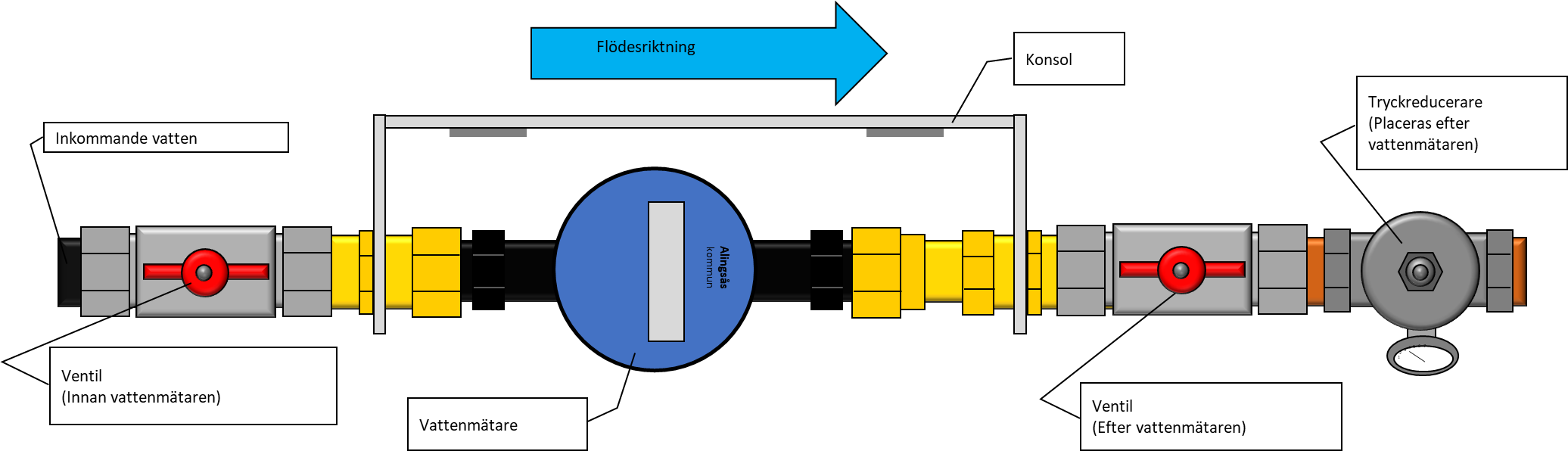 Vattenmätaren mäter hur mycket kallvatten du förbrukar. Den ägs av Alingsås kommun, men som fastighetsägare måste du upplåta plats för mätaren och ge oss tillträde vid behov. I Alingsås är det personal från Alingsås kommun som utför byten och kontroll av mätaren.