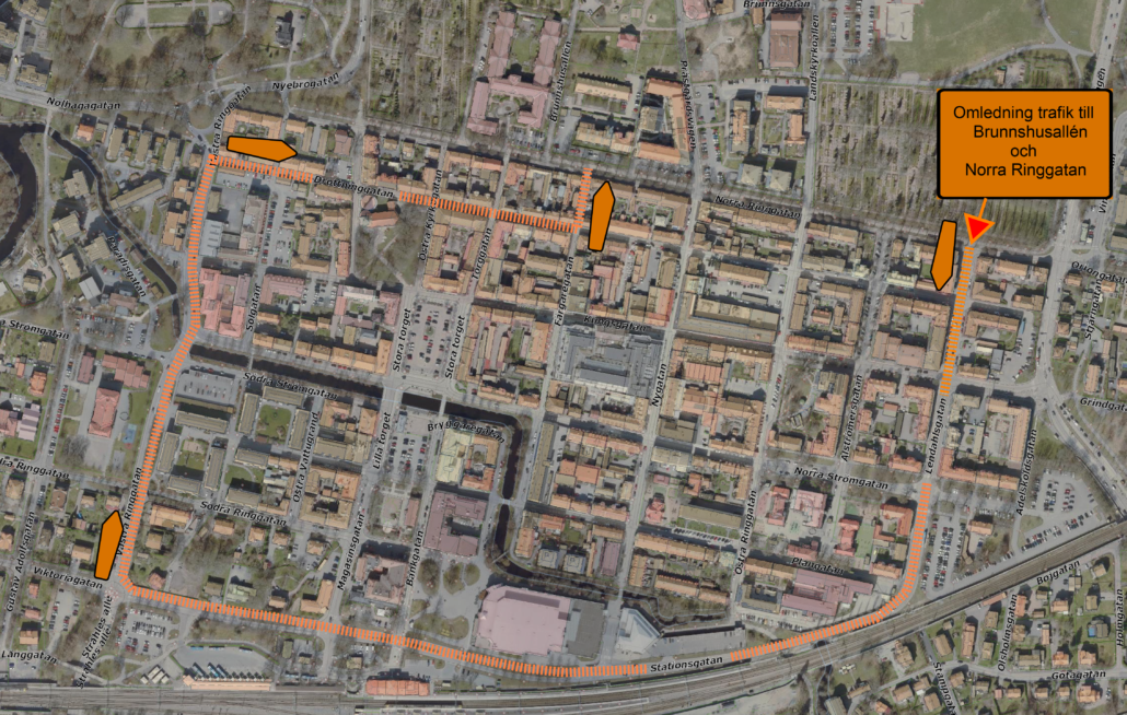 Inkommande trafik till Brunnshusallén och Kv. Månen (Drottninggatan 32-34) leds om via Drottninggatan och Färgaregatan och ut på Norra Ringgatan ut vidare på ordinarie väg på Norra Strömgatan. Observera att tillåten körriktning på Färgaregatan ändras under byggtiden för att möjliggöra den här omledningen.